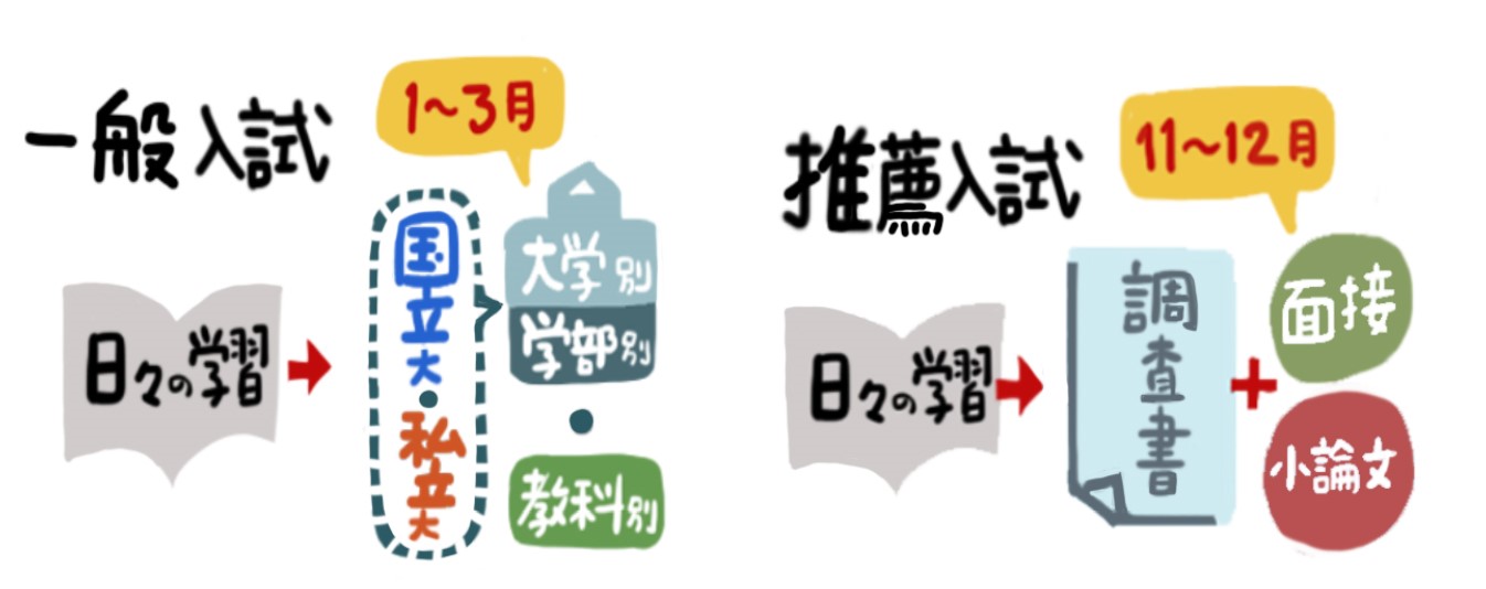 学力試験で勝負する入試で、当日の状況次第では一発逆転も可能な入試です。基本的にはペーパーテストですが、医療系学部は面接も実施するところが多いです。調査書の提出はしますが、ほぼ入試の結果には影響しません。 - 学校推薦型選抜(公募推薦、指定校推薦)